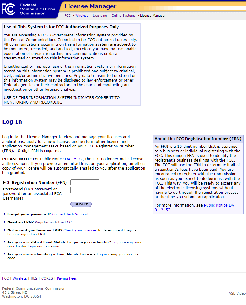 License Manager – Login Website – The page should look like the one below. If it doesn’t most likely you are on the wrong FCC page.