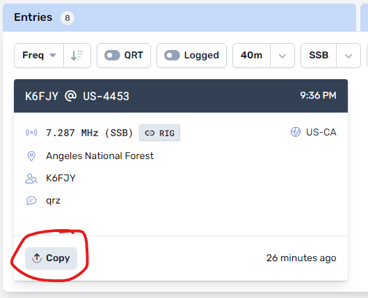 Once you find an activator you want to make a contact with. You then press the copy button on the card. This will copy the QSL information to the top section and you can amend the data as need. usually only the signal reports need to be edited.